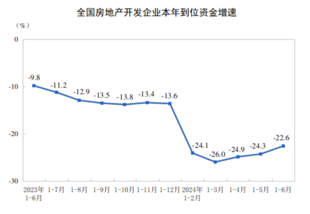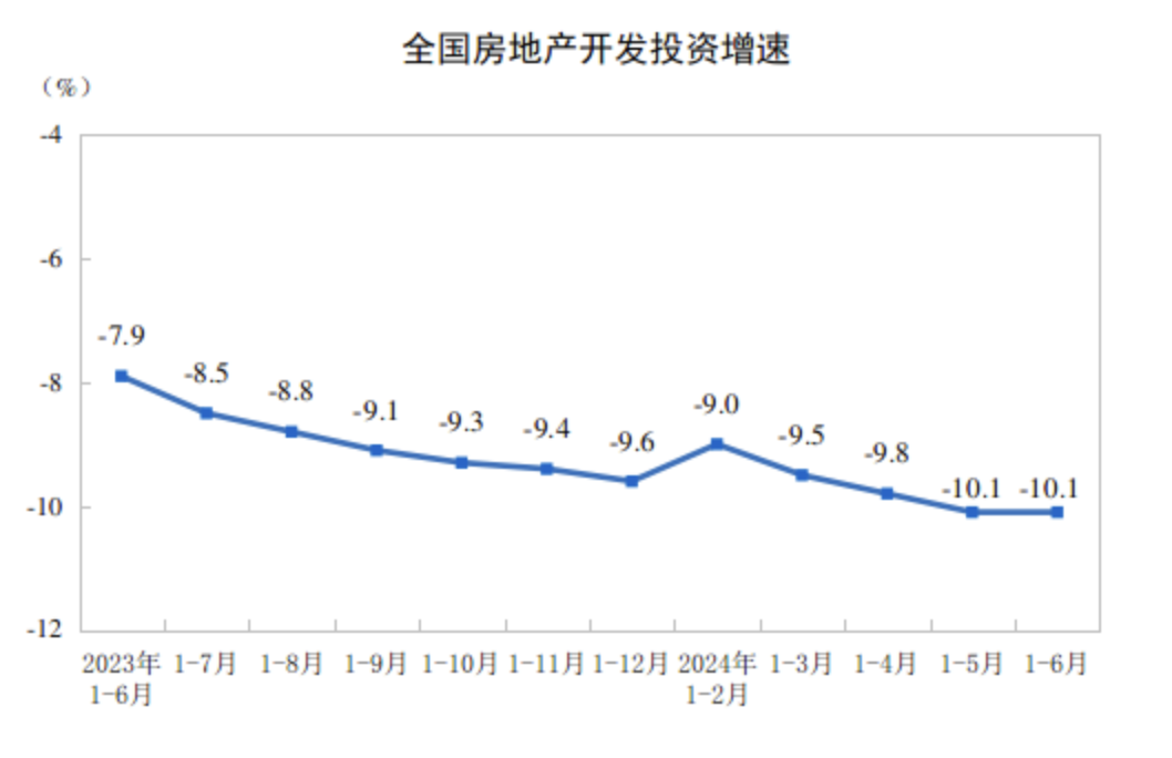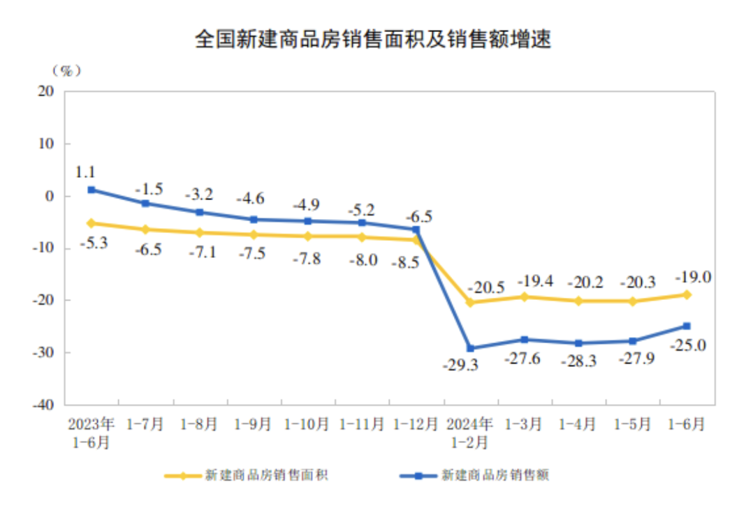 7月15日,国家统计局发布2024年1—6月份全国房地产市场基本情况。数据显示,上半年房地产开发投资尚未出现明显好转迹象,同比下降10.1%。 同日,国家统计局新闻发言人就2024年上半年国民经济运行情况答记者问时表示,近期房地产市场活跃度有所提升。各地区各部门适应房地产市场供求关系发生重大变化的新形势,因城施策,积极调整优化房地产政策,扎实做好保交房工作,支持刚性和改善性住房需求,政策效应逐渐释放,市场活跃度有所提升。上半年,全国新建商品房销售面积、销售额同比分别下降19%、25%,降幅比1—5月份收窄1.3、2.9个百分点;房屋新开工面积、房地产开发企业到位资金降幅也有所收窄。 ![]() 上半年房地产开发投资同比下降10.1% 房地产开发投资尚未出现明显好转迹象。 国家统计局数据显示,1—6月份,全国房地产开发投资52529亿元,同比下降10.1%(按可比口径计算);其中,住宅投资39883亿元,下降10.4%。 据中指研究院监测,6月单月,全国房地产开发投资额为1.2万亿元,同比下降10.1%,降幅较5月收窄0.9个百分点。 广开首席产业研究院资深研究员马泓指出,2024年6月末,全国房地产市场景气度在低位略有改善,以上海为代表的少部分大城市房地产市场信心回暖。不过,国内大部分城市楼市仍然处于深度调整阶段,房企资金来源、房屋新开工面积累计同比跌幅超过两成,施工及竣工跌幅扩大,导致上半年房地产投资跌幅依旧超过10%。 国家统计局数据显示,1—6月份,房地产开发企业房屋施工面积696818万平方米,同比下降12.0%。其中,住宅施工面积487437万平方米,下降12.5%。房屋新开工面积38023万平方米,下降23.7%,降幅较1-5月收窄0.5个百分点。其中,住宅新开工面积27748万平方米,下降23.6%,降幅较1-5月收窄1.4个百分点。房屋竣工面积26519万平方米,下降21.8%。其中,住宅竣工面积19259万平方米,下降21.7%。 1-6月新建商品房销售额、销售面积同比降幅均收窄 从销售端数据来看,1-6月新建商品房销售额、销售面积同比降幅有所收窄。 ![]() 国家统计局数据显示,1—6月份,新建商品房销售面积47916万平方米,同比下降19%,其中住宅销售面积下降21.9%。新建商品房销售额47133亿元,下降25.0%,其中住宅销售额下降26.9%。 国家统计局新闻发言人表示,上半年,全国新建商品房销售面积、销售额同比分别下降19%、25%,降幅比1—5月份收窄1.3、2.9个百分点。 中指研究院指出,从数据来看,全国方面,1-6月新建商品房销售额、销售面积同比降幅均收窄,6月单月,在去年同期高基数效应减弱下,同比降幅收窄至15%以内。重点城市方面,上海、深圳、杭州前期政策优化后,6月市场情绪明显提升,新房成交规模环比均增长,二手房成交规模保持高位,其中上海6月二手商品房成交超2.6万套,创近一年新高,恢复至2020-2021月均水平;北京6月26日跟进5.17新政,市场活跃度回升,6月二手住宅网签接近1.5万套,二手房市场修复节奏好于新房。 中指研究院认为,当前在“以价换量”以及政策显效下,重点城市二手房市场活跃度保持在较高水平,新房市场活跃度亦出现一定边际改善,但市场调整压力仍在。 截至6月末,商品房待售面积73894万平方米,同比增长15.2%。其中,住宅待售面积增长23.5%。 ![]() 1-6月房企到位资金同比下降22.6%,连续3个月降幅收窄 从房企资金来源来看,1-6月房企到位资金同比下降22.6%,连续3个月降幅收窄。 国家统计局数据显示,1—6月份,房地产开发企业到位资金53538亿元,同比下降22.6%,降幅较1-5月收窄1.7个百分点。 其中,国内贷款8207亿元,下降6.6%;占比为15.3%,比上年同期提升2.7个百分点。利用外资13亿元,下降51.7%;自筹资金18862亿元,下降9.1%;定金及预收款15999亿元,下降34.1%,降幅较1-5月收窄2.6个百分点;占比为29.9%,比上年同期下降5.4个百分点。1-6月,个人按揭贷款为7749亿元,同比下降37.7%,降幅较1-5月收窄2.5个百分点;占比为14.5%,比上年同期下降3.6个百分点。 易居研究院研究总监严跃进指出,房企到位资金指标有所改善,但也还是可以看出资金缺口还需要补充。尤其是销售端市场虽然有复苏态势,但绝对规模偏小,客观上会制约企业的资金状况。 展望下半年,马泓认为,受基数因素和政策推动的效应,房地产销售跌幅可能边际改善,但房企仍受困于流动性风险,房地产工程建设将放缓,施工面积下跌趋势可能短期内难以改变,预计全年房地产投资跌幅在10%-12%左右。 |